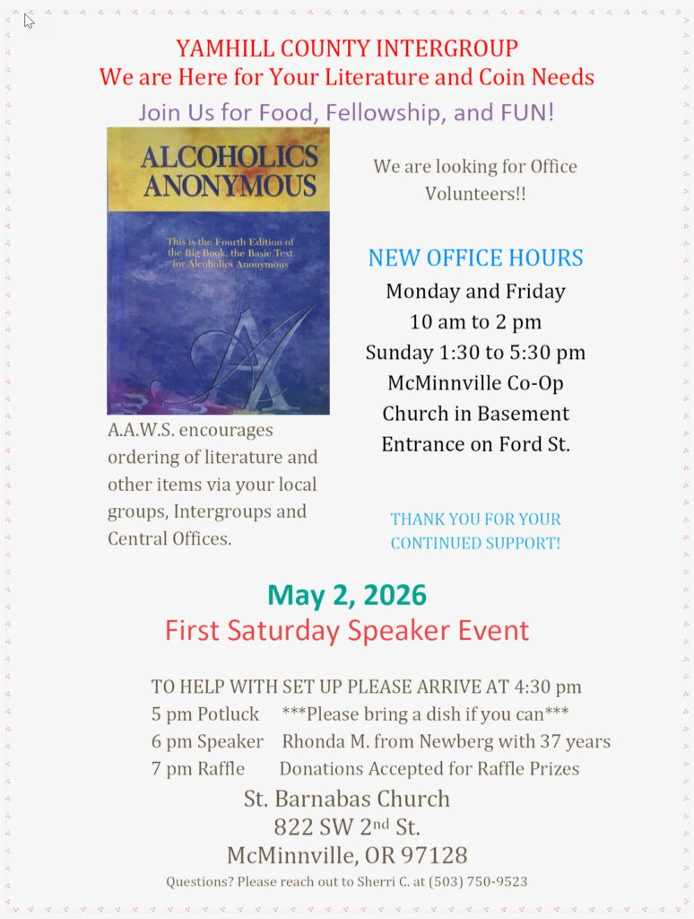 All requests must be for an AA approved event within Yamhill County (District 22) to be accepted. For all requests outside of District 22, please contact Area 58 at:
